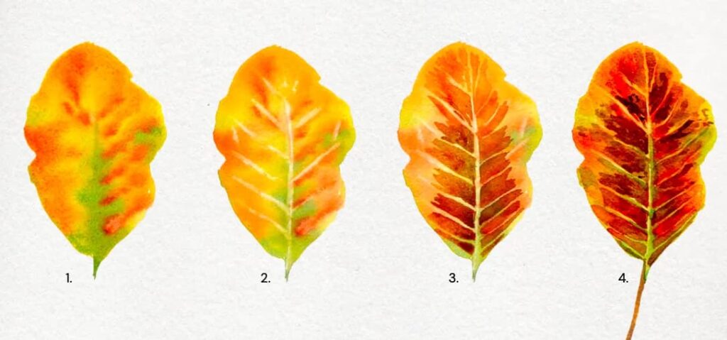 3. Une fois la première couche sèche, j’ai déposé une couche plus foncée. Ici, je me suis concentrée sur le centre de la feuille.